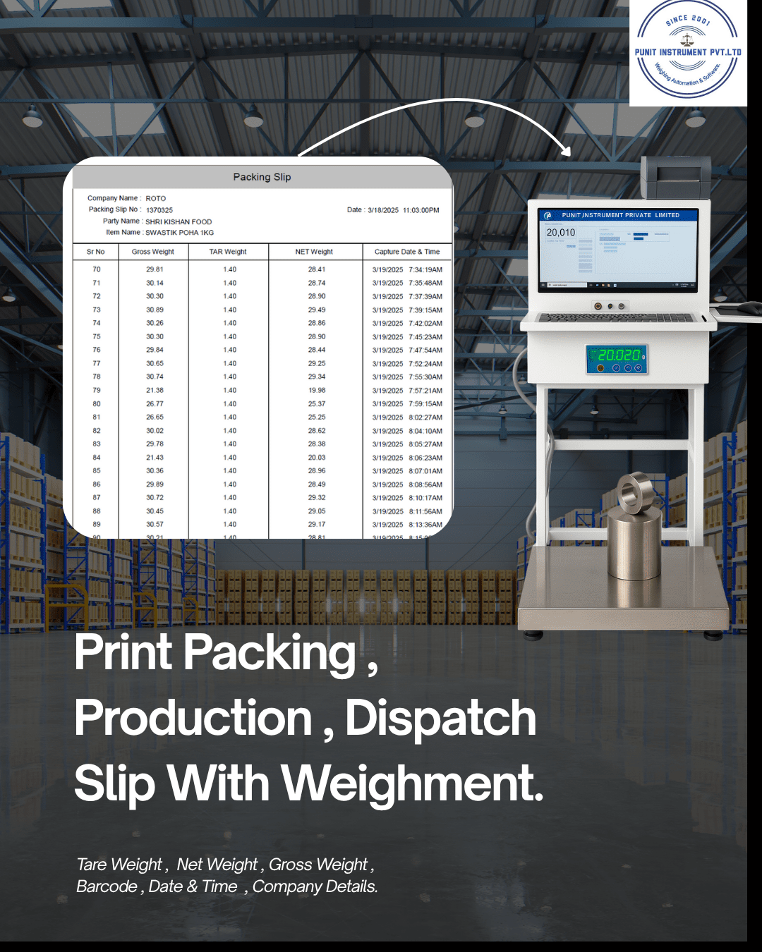 Before: Dispatch team entered weights manually in registers. Labels were handwritten. Frequent mismatch in actual stock vs ERP stock.